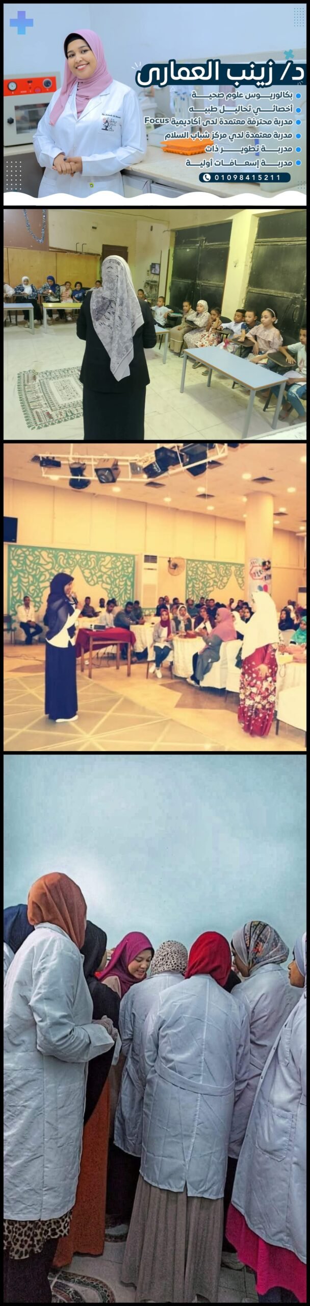 لا تقف إنجازات الدكتورة زينب عند العمل الإداري أو الفني فقط، بل تمتد إلى الجانب الإنساني والتعليمي أيضًا. فهي مدرب معتمد في عدة مجالات مهمة، أبرزها التحاليل الطبية وتطوير الذات والإسعافات الأولية، حيث تؤمن بأن نقل العلم ونشر الوعي الصحي هما رسالة سامية لا تقل أهمية عن ممارسة المهنة نفسها.