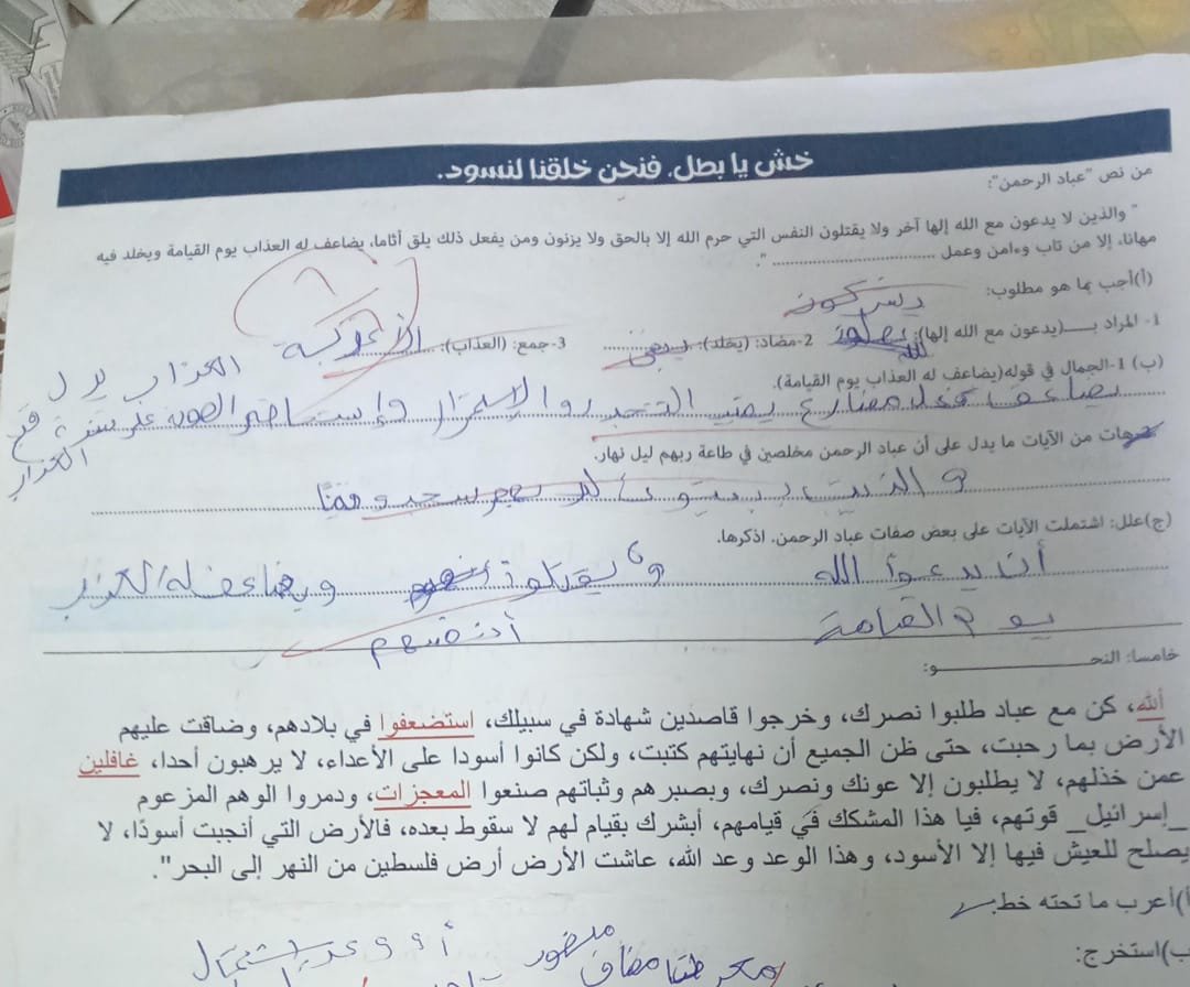 القطعة التي أعدّها لطلابه لم تكن مجرد تمرينٍ لغوي، بل لوحة وجدانية تفيض حبًا للأرض والحق والمقاومة. جاءت عباراتها مشحونة بالعاطفة، تدعو إلى الثبات والنصر، وتستحضر مشهد الأبطال الذين خرجوا طلبًا للشهادة في سبيل الله دفاعًا عن أوطانهم، وتؤكد أن فلسطين ليست مجرد قضيةٍ عابرة، بل رمزٌ للكرامة العربية والإسلامية.