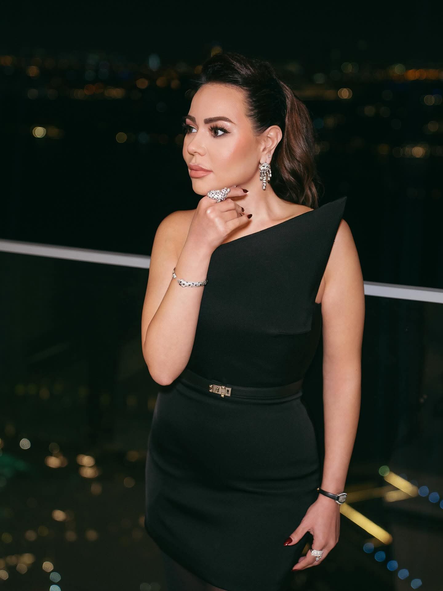 ولم تكتمل أناقة أسما دون لمساتها اللامعة من Cartier، حيث تألقت بساعتها ومجوهراتها الفاخرة التي أضفت لمسة من البريق على الإطلالة.