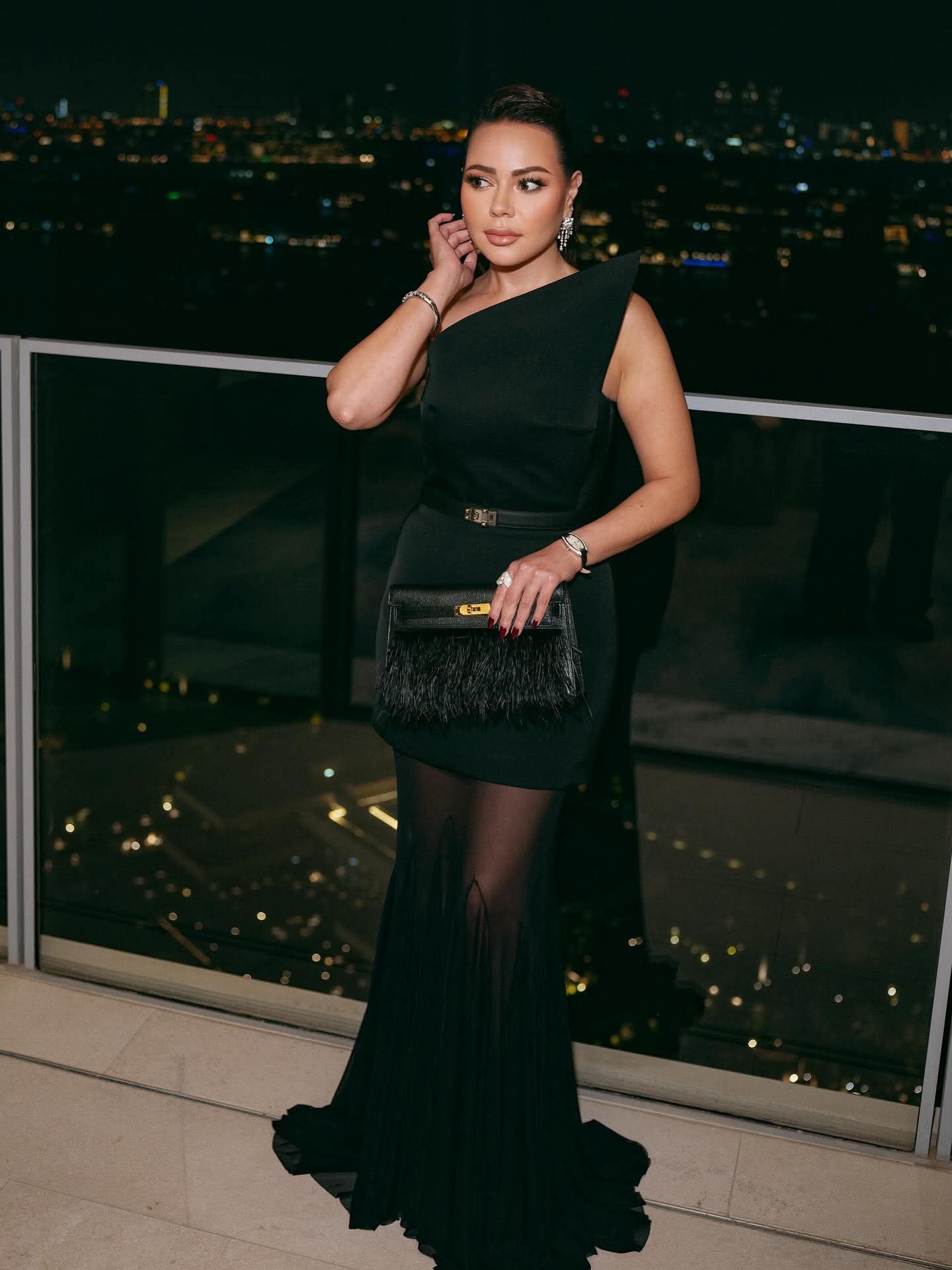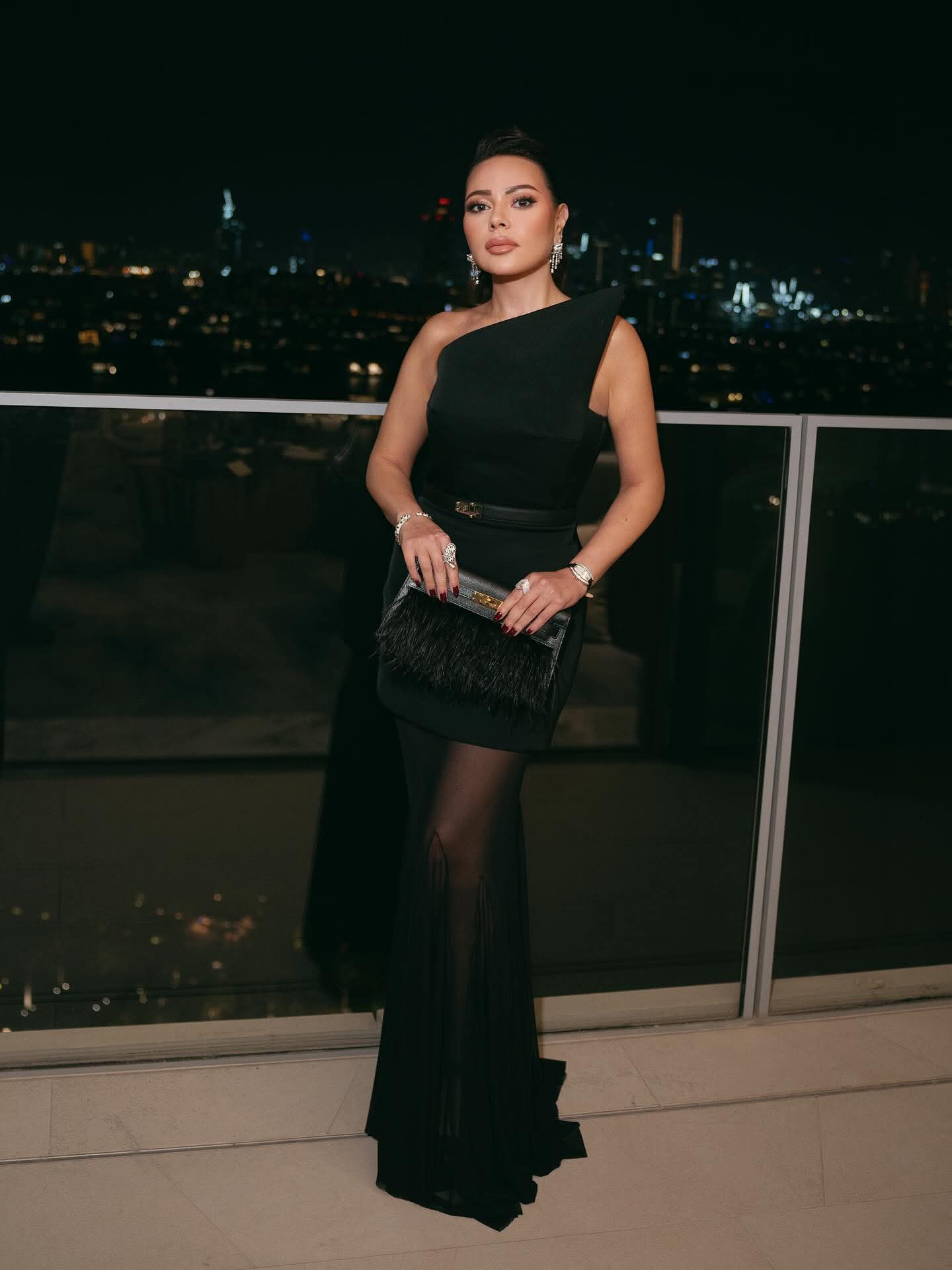 اختارت أسما فستاناً أسود بتصميم أنثوي جذّاب من توقيع David Koma London، أبرز جمالها بأسلوب عصري راقٍ، وأكملت إطلالتها بحزام وحقيبة كلتش من Hermès، وحذاء كلاسيكي راقٍ من Dior.