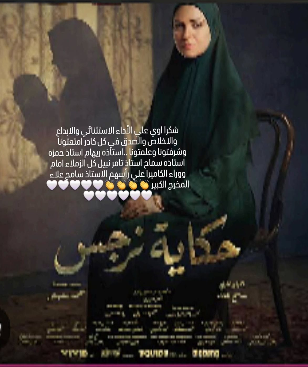 كما وجهت الفنانة منى زكي الشكر لطاقم مسلسل “حكاية نرجس”، بطولة الفنانة ريهام عبد الغفور، مشيدة بأدائهم المتميز وروح الإبداع التي أظهروها.
