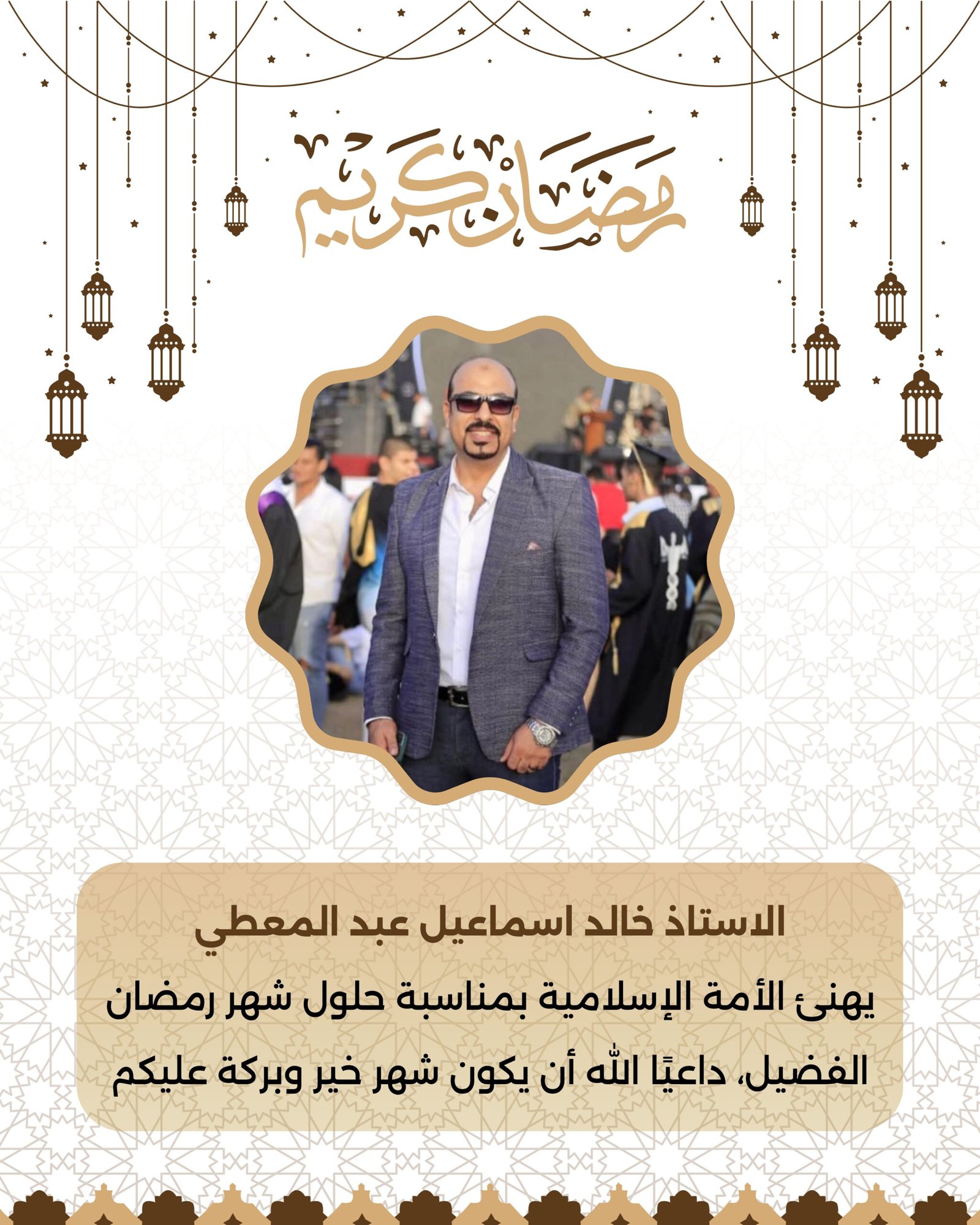 يتقدم مستر” خالد اسماعيل عبد المعطي” بأسمى آيات التهاني وأطيب الأمنيات إلى الأهل والأصدقاء والزملاء وجميع الأمة الإسلامية بمناسبة حلول شهر رمضان المبارك، أعاده الله علينا وعليكم بالخير واليُمن والبركات.