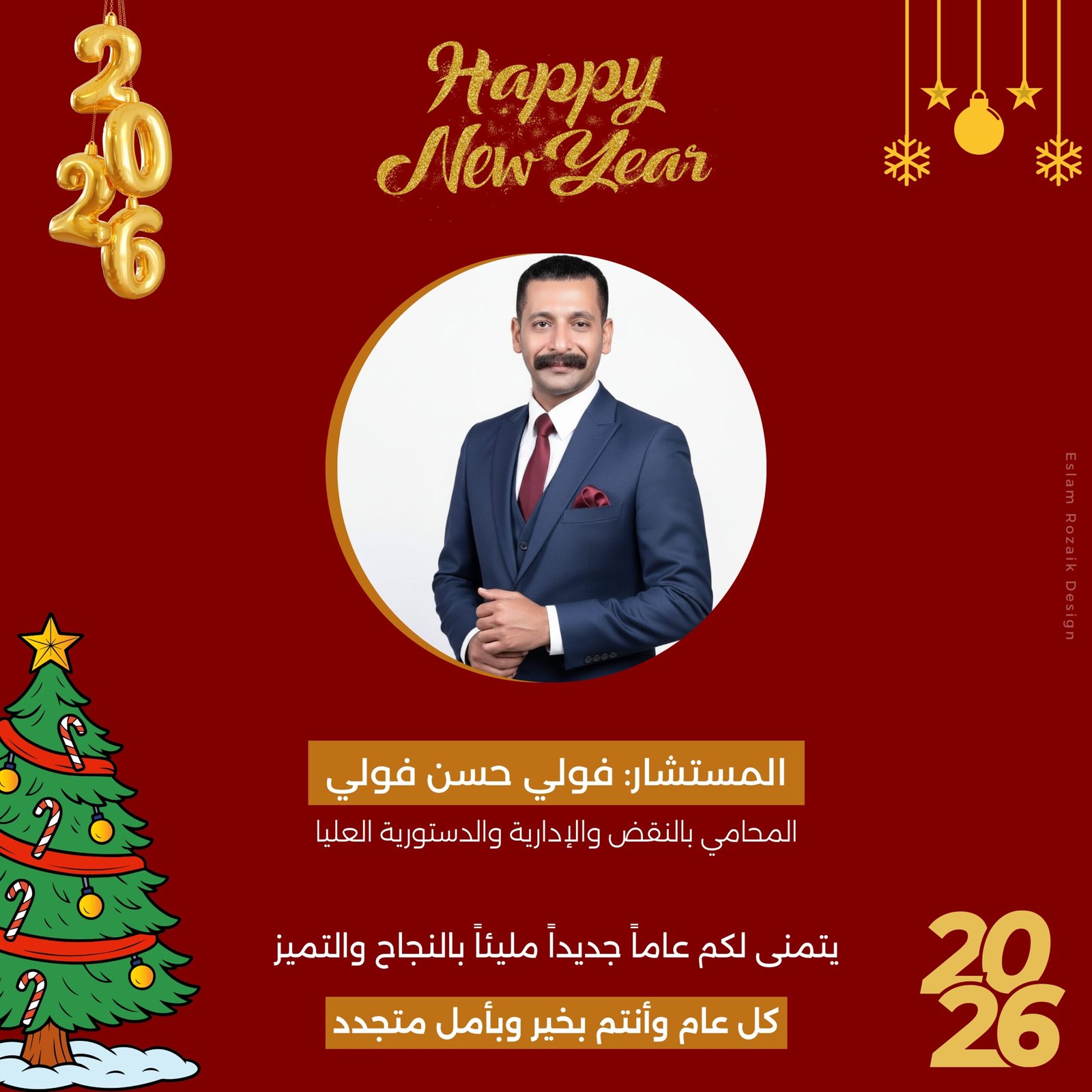 بمناسبة إشراقة عامٍ جديد، يسعدني ويشرفني أنا المستشار / فولي حسن فولي أن أتقدم إليكم جميعًا، بكل المحبة والتقدير، بأصدق التهاني وأطيب الأمنيات بحلول عام 2026، عامًا نرجو الله أن يكون مليئًا بالخير والطمأنينة والنجاح لكل إنسان.
