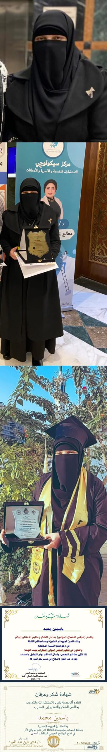 وقد حصدت تقديرًا واسعًا على المستويين المحلي والدولي، حيث حصلت على شهادة تقدير من مجلس الأعمال الدولي، بالإضافة إلى العديد من شهادات التكريم من جهات علمية وأكاديمية مرموقة، تقديرًا لجهودها وإسهاماتها المتميزة.