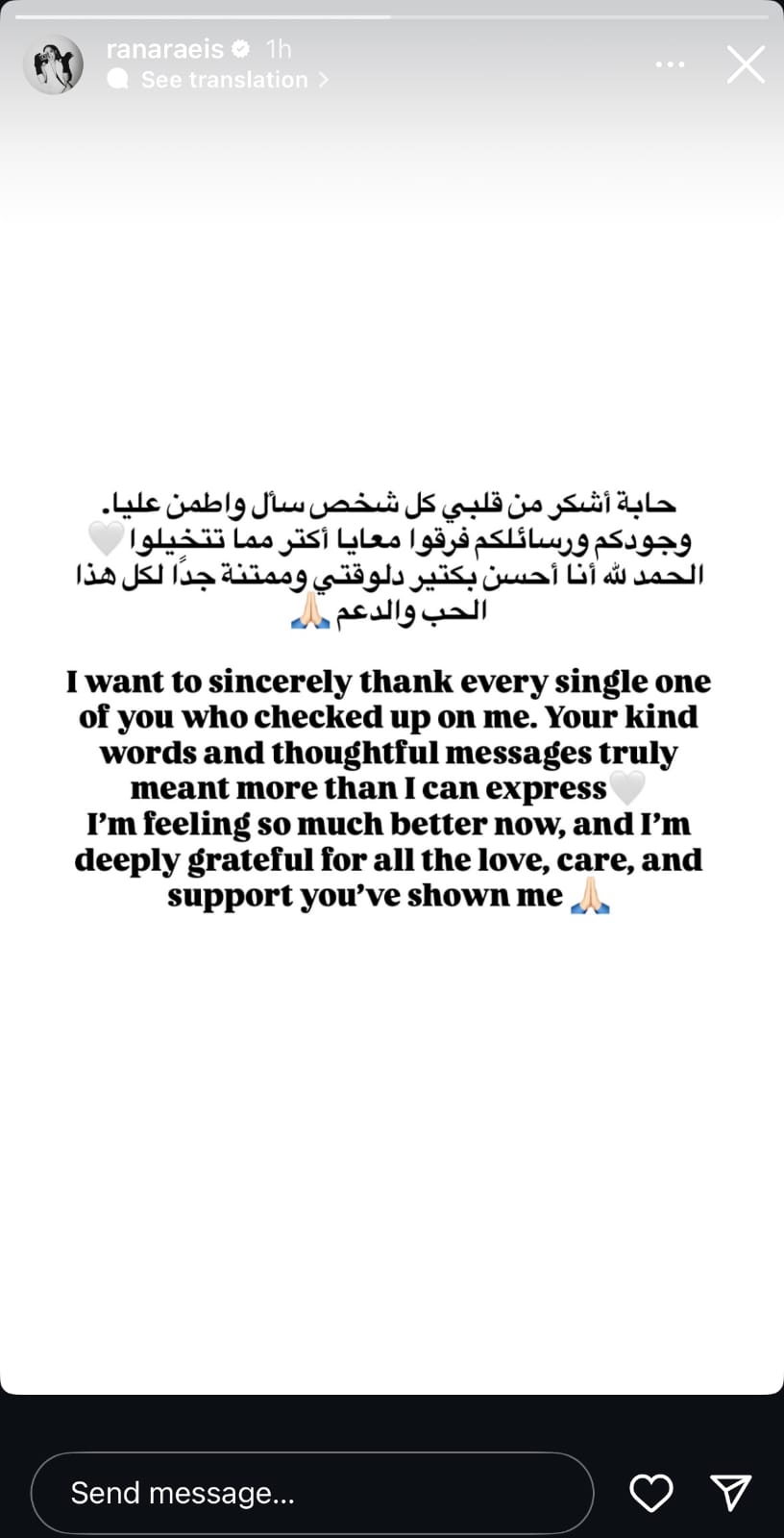 “حابة أشكر من قلبي كل شخص سأل واطمن عليا، وجودكم ورسائلكم فرقوا معايا أكتر مما تتخيلوا. الحمد لله أنا أحسن بكتير دلوقتي وممتنة جدًا لكل هذا الحب والدعم”.