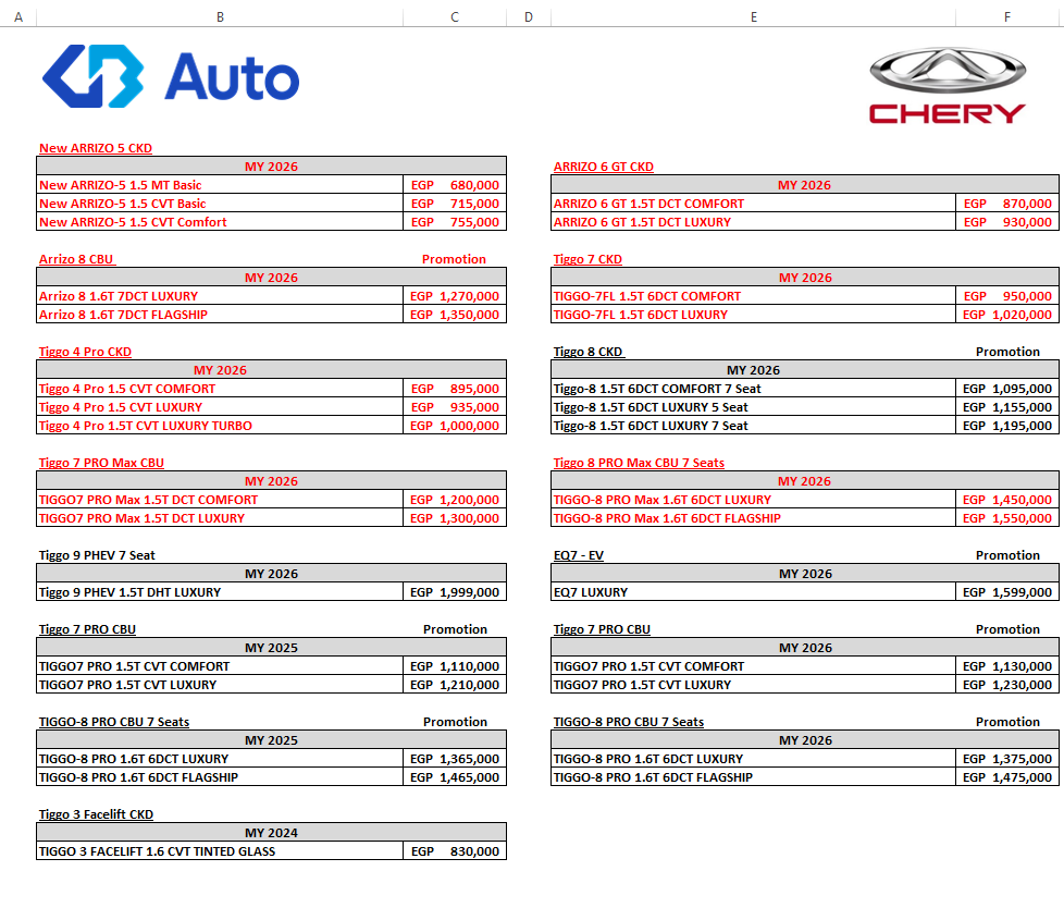 أعلنت مجموعة جي بي أوتو، وكيل علامة شيري في مصر، عن قائمة أسعار سيارات شيري 2026 بعد زيادة 7 طرازات دفعة واحدة شملت أريزو 5 المجمعة محليًا، وأريزو 6، وأريزو8، وتيجو 4، وتيجو 7، وتيجو 7 برو ماكس، وتيجو 8 برو ماكس، وتيجو 4 برو.