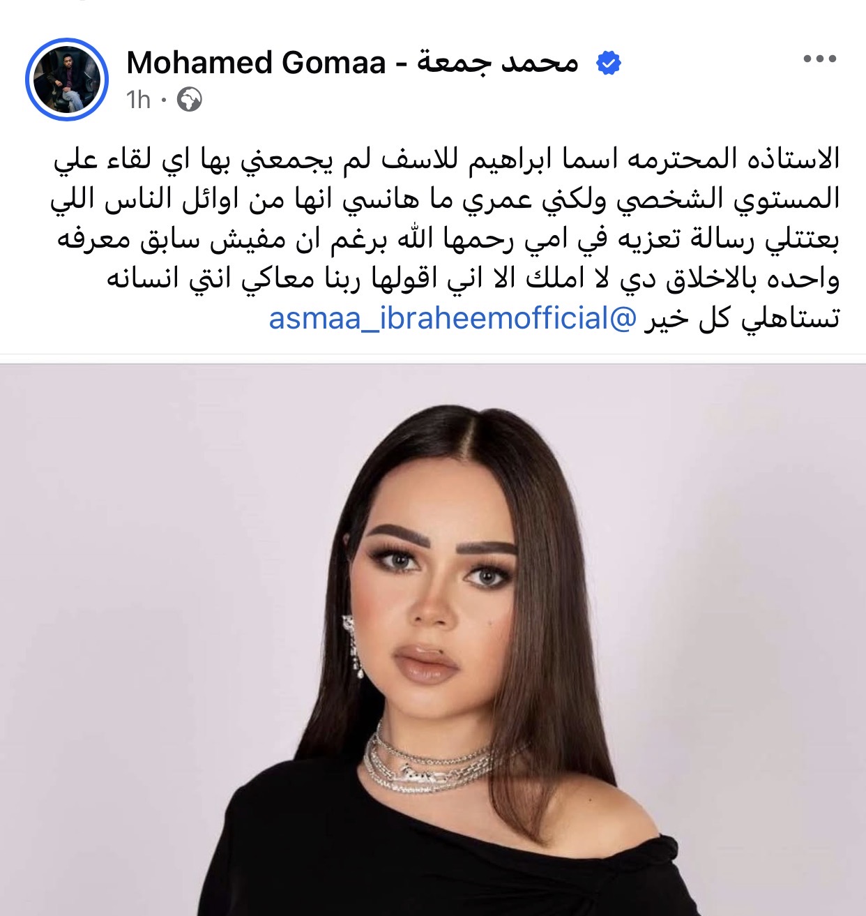 ونشر الفنان محمد جمعة عبر صفحته على “فيسبوك”، قائلًا: “الأستاذة المحترمة أسما إبراهيم للأسف لم يجمعني بها أي لقاء على المستوى الشخصي ولكني عمري ما هانسي أنها من أوائل الناس اللي بعتتلي رسالة تعزية في أمي رحمها الله برغم أن مفيش سابق معرفة.. واحدة بالاخلاق دي لا أملك إلا إني أقولها ربنا معاكي إنتي إنسانة تستاهلي كل خير”.