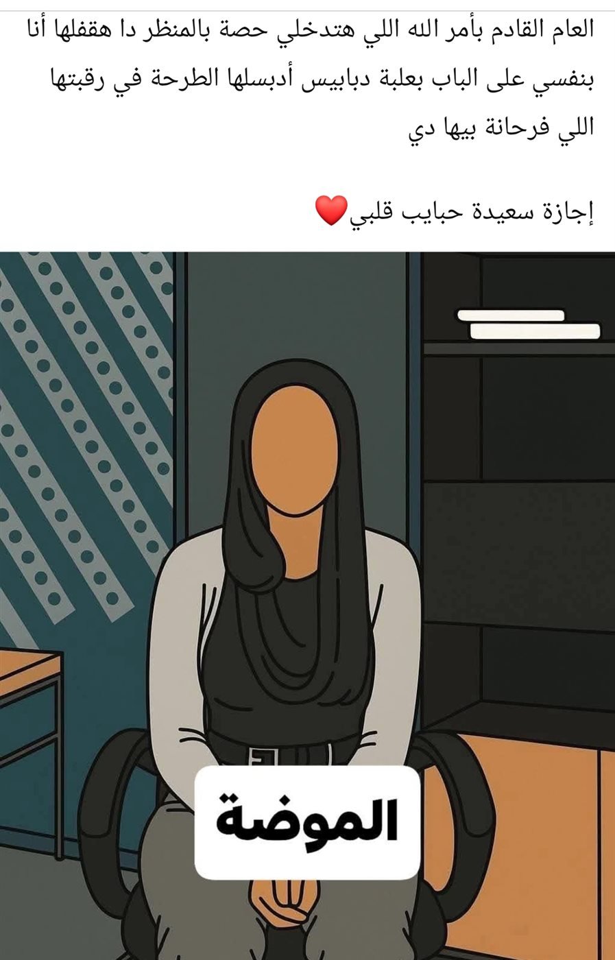 وقالت المعلمة في منشورها، الذي لاقى تفاعلًا كبيرًا بين رواد مواقع التواصل الاجتماعي: “طالباتي الأعزاء.. العام المقبل بأمر الله، اللي هتدخلي حصة بالمنظر دا هقفلها أنا بنفسي على الباب بعلبة دبابيس وأدبسلها الطرحة في رقبتها اللي فرحانة بيها دي، إجازة سعيدة حبايب قلبي”.