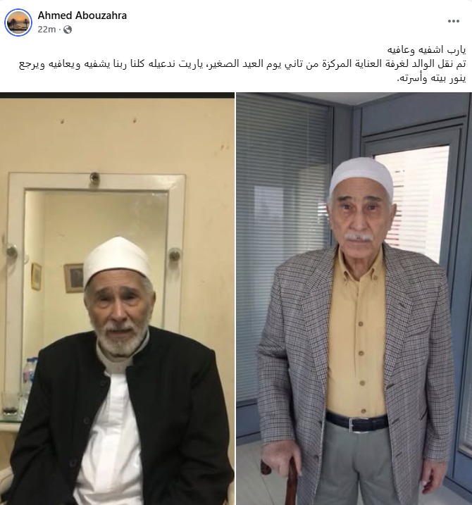 وكتب أحمد أبو زهرة عبر حسابه على منصة “فيسبوك”: “يا رب اشفيه وعافيه تم نقل الوالد لغرفة العناية المركزة منذ ثاني أيام العيد، يا ريت ندعيله كلنا ربنا يشفيه ويعافيه ويرجع ينور بيته وأسرته”.